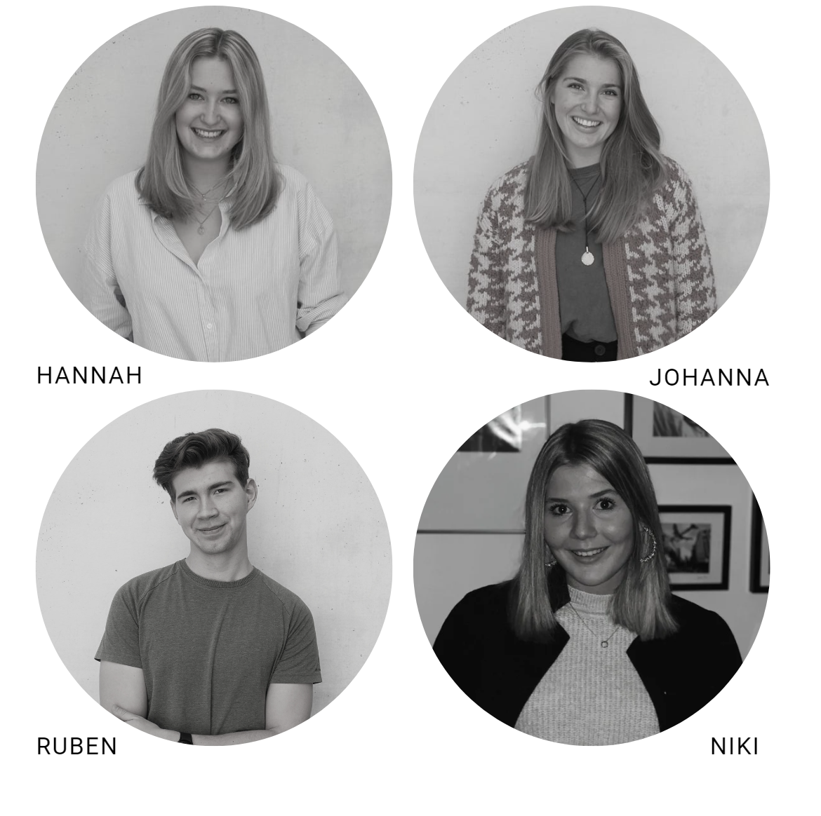 KultNow ist ein Team von vier jungen Kulturliebhaber:innen: Mit einem Abschluss in Kultur- und Kommunikationsmanagement an der Zeppelin Universität ist Hannah die kreative Visionärin. Ihre Leidenschaft für kreatives Design und innovative Lösungsansätze prägen das Produkt. Johanna ist mit einem Studium der Wirtschaftswissenschaften der strategische, organisatorische Lead des Teams, beschäftigt sich viel mit der Ausarbeitung von Finanz- und Geschäftsplänen sowie der Klärung rechtlicher Themen. Mit einem Abschluss in Informatik an der TUM ist Ruben der Head of IT. Er hat den ersten MVP entwickelt und ist insbesondere verantwortlich für den Bau des Backends, der AI und der Website mit einem funktionierendem Daten Management System. Mit ihrem Studium der Kunstgeschichte und Wirtschaft in München ergänzt Niki das Team mit umfangreichem Wissen über die deutsche Kunst- und Kulturszene. Durch ihre Arbeit in der Galerie König und der Neuen Nationalgalerie, ist Niki in der Branche bestens vernetzt und kennt wertvolle Partner, die uns einen erfolgreichen Eintritt in die deutsche Kulturszene ermöglichen.