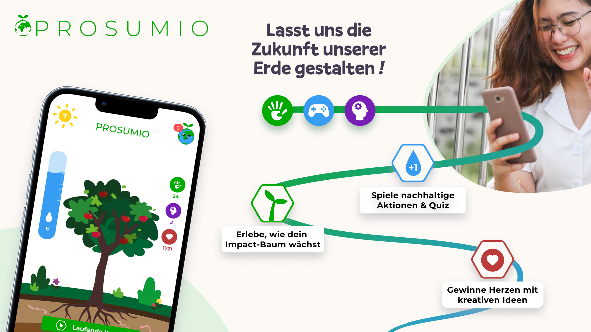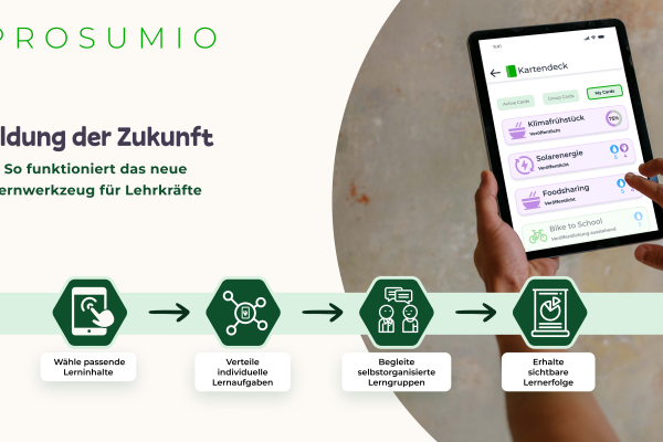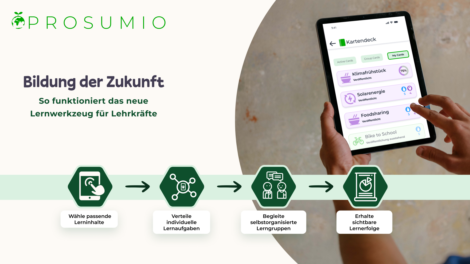 Die Bildungsapp PROSUMIO® gamifiziert Lernerfahrungen und verbindet spielerisches Lernen mit handfesten Skills für eine nachhaltige Zukunft. Die spielbasierte App ermöglicht es Schüler:innen und Auszubildenden, eigene Aktionsideen zu realisieren, dabei gemeinsam mit Freund:innen zu lernen und ihr Potenzial zu entfalten. Für Lehrkräfte wird durch die App die Unterrichtsvorbereitung, Korrektur und Dokumentation vereinfacht. Die freigewordene Zeit kann genutzt werden, um in der Rolle als Lerncoach:in Lernprozesse mit der App zu begleiten und Lernende individuell zu unterstützen. Um wirklich sinnvolle, praktische Einsatzmöglichkeiten der Bildungsapp zu erproben, entwickelt das PROSUMIO Team gemeinsam mit Lehrkräften und Ausbilder:innen nachhaltigkeitsorientiertes Lernmaterial sowie bedarfsorientierte Blended-Learning Formate für den Unterricht.